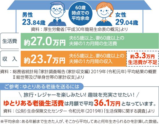 日本人の平均余命は年々延び続けています。主な収入を公的年金に頼った場合、高齢者の夫婦世代では、毎月の生活費が不足することとなります。不足する生活費を補い、「ゆとりある老後」をおくるためには、自助努力による資産形成が必要です。