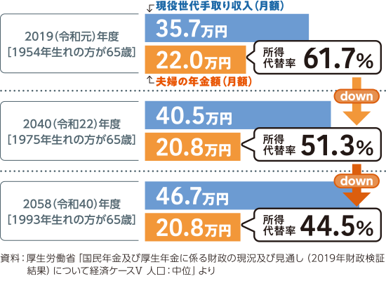 公的年金額が現役世代の平均収入に対して、どのくらいの割合になるかを「所得代替率」といいます。2019年(令和元年)の財政検証結果では、所得代替率が50%を下回るパターンも想定されており、より一層、将来への備えの必要性が高まっています。